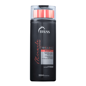 Características: Marca: Truss Linha: Miracle Summer Categoria: Shampoo Volume: 300ml Indicação: Cabelos expostos ao sol, mar ou piscina Ativos Principais: Vitaminas, aloe vera e filtro solar Textura: Líquida e suave Livre de: Parabenos, sulfatos e silicones Cruelty-Free: Sim
