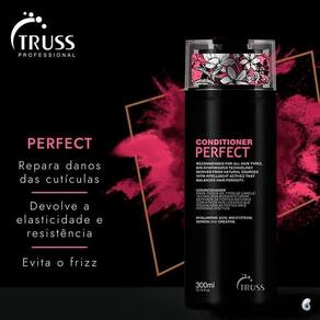 Truss Perfect - Condicionador 300ml Truss Perfect - Condicionador para todos os tipos de cabelo. Truss Perfect ajuda a reparar danos das cutículas causadas pelas agressões diárias. - A fórmula de Truss Perfect devolve suavemente a elasticidade e resistência, além de evitar o frizz. Sua embalagem conta com estampas exclusivas criadas pelo estilista Alexandre Herchcovitch. Conselho de Aplicação - Passe o condicionador no cabelo úmido e massageie. Deixe agir por 2 minutos e enxágue. - Bio Affinity Complex: elaborado com fitonutrientes que reparam a cutícula fragilizada por processos químicos ou agressões externas. - Nano Repair: preenche as áreas danificadas no interior da fibra enquanto forma um adesivo sobre as cutículas para conservá-las sempre fechadas. - Polycare: polímero que forma um filme que proporciona maciez e brilho enquanto reduz o volume e o frizz e define os cachos. - Quatercare: polímero condicionante que facilita o pentear, proporciona corpo e manutenção da cor e reduz o frizz. - Ácido Hialurônico: hidrata e preenche a porosidade da fibra capilar. - Panthenol: tonifica o couro cabeludo, além de criar uma camada elástica na fibra capilar que hidrata e restaura os fios. - Cisteína: aminoácido que repara a cutícula e protege contra agressões externas. - Sericina: aminoácido que reconstrói o cabelo que passou por processos químicos. - Creatina: protege, revitaliza e hidrata os fios, proporcionando fios mais maleáveis. - Colágeno: devolve elasticidade e flexibilidade aos fios. - Wheat Protein: recupera a elasticidade da fibra capilar com a redução da quebra. - Seu cabelo fica resistente, protegido, saudável e sedoso.