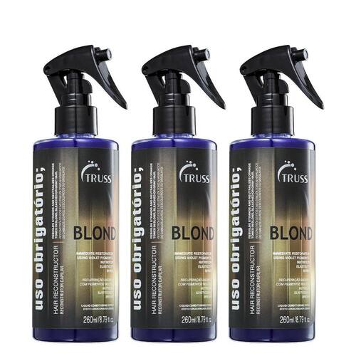 Truss uso obrigatório blond kit reconstrutor 3x260ml Tratamento reconstrutor e matizador para cabelos loiros, brancos descoloridos ou com luzes. Truss uso obrigatório blond restaura a integridade dos fios ao mesmo tempo que neutraliza os tons amarelados e alaranjados indesejados para promover um efeito platinado bonito. Como a química, sobretudo a descoloração, danifica bastante os fios, truss uso obrigatório blond é rico em ativos que fortalecem, hidratam e nutrem, de forma encorporar o cabelo para que ele se torne mais resistente. Logo na primeira aplicação é possível sentir o resultado. Modo de usar: Conselho de aplicação borrife o produto pelo comprimento e pontas do cabelo úmido e limpo. Use-o depois do shampoo e antes do condicionador. Deixe agir entre 30 segundos até 5 minutos, no máximo e enxágue. O truss uso obrigatório blond não deve ser como leave-in, sem enxágue. A matização pode variar de acordo com a estrutura do fio e o tempo de pausa, por isso a indicação no rótulo deve ser respeitada. Não use o tratamento no dia da descoloração ou das luzes, pois os fios podem absorver pigmentos demais. Na primeira aplicação, deixe agir entre 30 segundos e 1 minuto. Nas próximas vezes, aumente o tempo caso seja necessário, mas sempre respeitando o máximo de 5 minutos. Use quando for necessário restaurar os fios ou platinar. Contem 3 unidades truss uso obrigatorio blond tratamento reconstrutor 260ml Marca: Não Informado