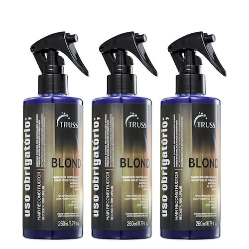Truss uso obrigatório blond kit reconstrutor 3x260ml Tratamento reconstrutor e matizador para cabelos loiros, brancos descoloridos ou com luzes. Truss uso obrigatório blond restaura a integridade dos fios ao mesmo tempo que neutraliza os tons amarelados e alaranjados indesejados para promover um efeito platinado bonito. Como a química, sobretudo a descoloração, danifica bastante os fios, truss uso obrigatório blond é rico em ativos que fortalecem, hidratam e nutrem, de forma encorporar o cabelo para que ele se torne mais resistente. Logo na primeira aplicação é possível sentir o resultado. Modo de usar: Conselho de aplicação borrife o produto pelo comprimento e pontas do cabelo úmido e limpo. Use-o depois do shampoo e antes do condicionador. Deixe agir entre 30 segundos até 5 minutos, no máximo e enxágue. O truss uso obrigatório blond não deve ser como leave-in, sem enxágue. A matização pode variar de acordo com a estrutura do fio e o tempo de pausa, por isso a indicação no rótulo deve ser respeitada. Não use o tratamento no dia da descoloração ou das luzes, pois os fios podem absorver pigmentos demais. Na primeira aplicação, deixe agir entre 30 segundos e 1 minuto. Nas próximas vezes, aumente o tempo caso seja necessário, mas sempre respeitando o máximo de 5 minutos. Use quando for necessário restaurar os fios ou platinar. Contem 3 unidades truss uso obrigatorio blond tratamento reconstrutor 260ml Marca: Não Informado Ean: 7895857246748