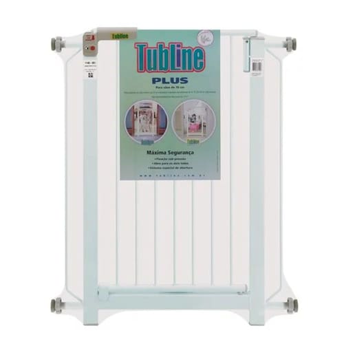 Tubline Portão Automático - Abre para os dois lados; - Fixação sob pressão; - Grade para vão de até 70 cm; - Altura: 85 cm Largura: 70 cm; - A grade Tubline pode servir como divisória entre os cômodos para quem tem cães ou crianças pequenas; - A grade pode ser ajustada com extensores para servir em portas mais largas, é leve e pode ser trocada de local com facilidade; - Traz segurança para você e sua família;