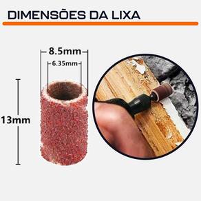 Tubo de Lixa 6.4mm 1/4 Pol. Grão 120 para Micro Retíficas Dremax - Marca: Dremax - Modelo: TBL002 - diâmetro interno do tubo: 6,45mm 1/4 Pol. - Diâmetro externo do tuubo: 8,5mm - Comprimento: 13mm - Gramatura: 120 - Compatível com todas as marcas de micro retífica do mercado - Indicado para moldar, aparar, dar forma, moagem fina, polimento. Acabamento, remoção de material, alisamento, remoção de ferrugem nos metais, etc. - Aplicado a materiais mais macios como madeira dura, madeira macia, plástico, fibra de vidro, alumínio, cerâmicas, borracha, unhas de animais, unhas artificiais, pedras e muito mais. - Velocidade de trabalho indicada: :: de 10.000 a 35.000rpm para madeiras, cerâmicas e pedras :: 35.000rpm para metais :: de 10.000 a 20.000rpm para plástico - : 90 dias contra defeitos de fabricação A DREMAX é a primeira e única marca brasileira dedicada exclusivamente às micro retíficas, acessórios e acoplamentos para esta indispensável ferramenta. Seja para trabalhos de precisão, artesanato, modelagem ou reparos, a DREMAX tem o produto certo para você.