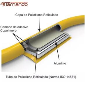 Tubulação 16mm multicamada para condução de gases combustíveis formado por 5 camadas: PE – Adesivo – Alumínio – Adesivo - PE.