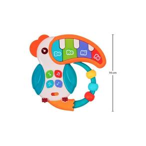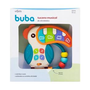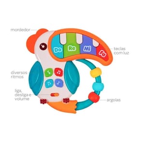 O Tucano Musical de Atividades com Luz - Buba 14188 É superdivertido Ao tocar as teclas, ele emite sons e musicas diversas. Para tornar a brincadeira ainda mais divertida, a luz do pianinho se acende e acompanha o ritmo dos sons. Com mordedor macio na crista, cores vibrantes e argolinhas interativas, é ideal para desenvolver os sentidos do bebê. Os tons vibrantes exercitam a visão e a diferenciação de cores;O toque estimula a coordenação motora;Os diferentes sons desenvolvem a percepção auditiva e rítmica;Trabalha a imaginação através das músicas e efeitos sonoros;Estimula os sentidos do bebê. Produto 100% atóxico;Com luz e som;Mordedor macio;Piano;Músicas diversas;Funções: liga/desliga/volume;Argolas interativas;Livre de BPA e ftalatosAlimentação: 2 pilhas AAA inclusas;Indicado para crianças acima de 6 meses;Segurança Inmetro: Innac OCP 0061 / CE-br/Innac 00110-13A NM 300/2002 Segurança do Brinquedo