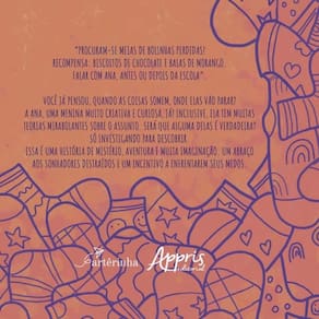 “PROCURAM-SE MEIAS DE BOLINHAS PERDIDAS! RECOMPENSA: BISCOITOS DE CHOCOLATE E BALAS DE MORANGO. FALAR COM ANA, ANTES OU DEPOIS DA ESCOLA”. VOCÊ JÁ PENSOU, QUANDO AS COISAS SOMEM, ONDE ELAS VÃO PARAR? A ANA, UMA MENINA MUITO CRIATIVA E CURIOSA, JÁ! INCLUSIVE, ELA TEM MUITAS TEORIAS MIRABOLANTES SOBRE O ASSUNTO. SERÁ QUE ALGUMA DELAS É VERDADEIRA? SÓ INVESTIGANDO PARA DESCOBRIR. ESSA É UMA HISTÓRIA DE MISTÉRIO, AVENTURA E MUITA IMAGINAÇÃO. UM ABRAÇO AOS SONHADORES DISTRAÍDOS E UM INCENTIVO A ENFRENTAREM SEUS MEDOS. Marca: ARTERINHA EDITORA