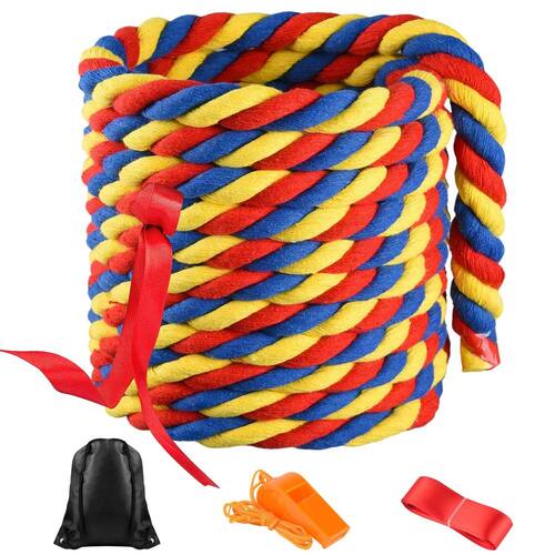 - O pacote inclui: O conjunto de jogos de dia de campo inclui 1 corda de cabo de guerra de 6 m, 1 x fitas vermelhas de 3 m (linha central), 1 x apito de árbitro e 1 x bolsa de armazenamento. Se o seu time passar o fio pela linha central, você ganha os jogos