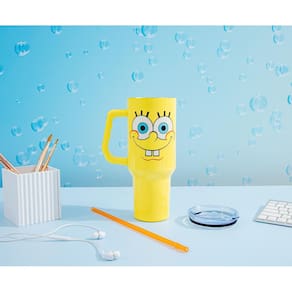 - BOB DE ESPONGEBOB: O copo temático apresenta o rosto do Bob Esponja Calça Quadrada contra um fundo amarelo. O design é apresentado em ambos os lados do copo.