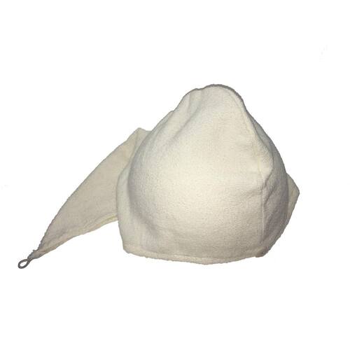 Turbante para secar o cabelo atoalhado cru, ele reduz pela metade o tempo de secagem do cabelo ao absorver a água e ajuda a diminuir o frizz, ótimo para segurar o cabelo e não deixar cair sobre o rosto ou roupa, já que conta com um fechamento em botão.
