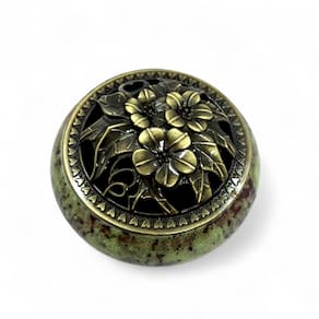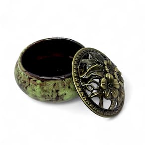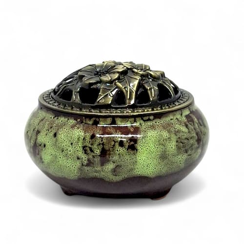 Incensário de cerâmica com tampa em metal na cor bronze envernizado. O Turíbulo é um incensário ideal para queimar incensos, defumação de resinas e ervas, Além de ser um belo item decorativo. O incensário de cerâmica é uma peça requintada e ideal para aromatizar qualquer local.