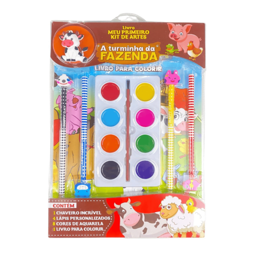 ‘Meu Primeiro Kit de Artes – A Turminha da Fazenda’ é um livro para colorir que cativa as crianças com a animada turma da fazenda em suas aventuras coloridas e divertidas. Acompanha 1 chaveiro incrível, 4 lápis personalizados com borracha, 8 cores de aquarela e 1 livro para colorir.