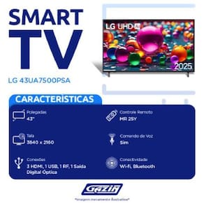 Tv 43p lg smart 4k ai comando de voz - 43ua7500psa . Cor: sem cor - voltagem: sem voltagem Descrição Smart tv lg ai 43 - 4k uhd 7 ai processor 4k gen8 webos 25 - 43ua7500psa Imagem 4k uhd 4k ultra hd 3,840 x 2,160 7 ai processor 4k gen8 4k super upscaling Hdr10 / hlg Mapeamento dinâmico de tom 60hz nativo Filmmaker mode Ã&129;udio 2.0 canais 7 ai sound pro virtual 9.1.2 upmix Bluetooth surround ready até 2.1 canais Ai acoustic tunning requer smart magic Conexões Entrada hdmi 2.0: 3 Entrada hdmi 2.1: 0 Entrada usb: 1ea v 2.0 Wi fi: sim wi-fi 5 Bluetooth in/out: sim v 5.0 Saída ã&147;ptica digital: 1 Entrada rf: 1 Outras informações : 12 meses Origem: nacional Código de homologação anatel: 09460-24-01925 Conteúdo da embalagem: controle remoto padrão, pilhas aaa x 2 un, cabo de energia destacável , manual do usuário, 01 controle remoto l-con 22y , 02 base Dimensões com base Altura: 62,1 cm Largura: 96,8 cm Profundidade: 20 cm Peso: 7,4 kg Dimensões sem base Altura: 56,7 cm Largura: 96,8 cm Profundidade: 6,8 cm Peso: 7,3 kg Homologação Anatel: 112572013224 Marca: Não Informado