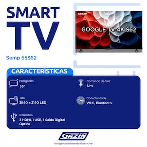 Com a interface Google TV, você tem acesso aos principais aplicativos de streaming, como Netflix, YouTube, Prime Vídeo e Disney+, diretamente na sua tela inicial. Utilize o Google Assistente, ativado através do controle remoto, para buscar conteúdos, abrir aplicativos ou obter informações usando apenas a sua voz. A TV conta com 16GB de memória interna para armazenar seus apps. A conectividade é completa, oferecendo Wi-Fi Dual Band (2.4 e 5 GHz) para uma conexão estável, Bluetooth 5.2 para conectar fones de ouvido ou soundbars sem fios, e Google Cast integrado para espelhar o conteúdo do seu celular na TV. As conexões físicas incluem 3 entradas HDMI, sendo uma delas compatível com a tecnologia ARC, 1 porta USB para reproduzir mídias, 1 entrada de rede (LAN) e 1 saída de áudio digital óptica.