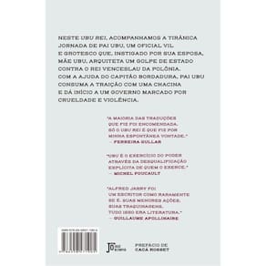 Edição ilustrada da obra que influenciou o surrealismo e o teatro do absurdo, com tradução de Ferreira Gullar. A estreia de Ubu rei, na Paris de 1896, foi um escândalo. Na peça, Alfred Jarry, seu autor, lança alguns importantes caminhos estéticos, grotescos e polêmicos, que seriam precursores de movimentos como o surrealismo e o teatro do absurdo. Não à toa, o poeta Stéphane Mallarmé, após assistir à primeira encenação da obra, decretou na plateia: “Jarry é poeta, e com este Ubu rei começa uma nova época.” O humor ácido de Alfred Jarry ainda choca, não só pelos atos e falas controversos de seus personagens, mas também por sua atualidade. As figuras caricatas de Ubu rei ilustram perfeitamente governos fascistas que assombraram o século XX e que insistem em emergir no século XXI. Talvez, por isso, o fascínio pela peça persista no imaginário coletivo e as montagens sejam profusas. No Brasil, uma das mais famosas é a do Teatro do Ornitorrinco, de 1985, com direção e atuação de Cacá Rosset no papel de Pai Ubu, Rosi Campos como Mãe Ubu e figurino assinado por Lina Bo Bardi. Esta edição da José Olympio conta com tradução de Ferreira Gullar, um dos maiores poetas da língua portuguesa. Gullar, ele mesmo um grande admirador da inventividade de Jarry, realizou esta tradução por vontade própria, sem encomenda. Seu gênio poético é perceptível nas tiradas cômicas e na transcriação dos neologismos, caros ao francês e a seu tradutor brasileiro. Cacá Rosset, outro entusiasta da irreverência de Jarry, assina o prefácio da edição, que se completa com capa e projeto gráfico do premiado estúdio de design Casa Rex. “Jarry é poeta, e com este Ubu rei começa uma nova época” – Stéphane Mallarmé “A maioria das traduções que fiz foi encomendada. Só o Ubu rei é que fiz por minha espontânea vontade.” – Ferreira Gullar “Alfred Jarry foi um escritor como raramente se é. suas menores ações, suas traquinagens, tudo isso era literatura.” – Guillaume Apollinaire “Ubu é o exercício do poder através da desqualificação explícita de quem o exerce.” – Michel Foucault