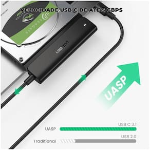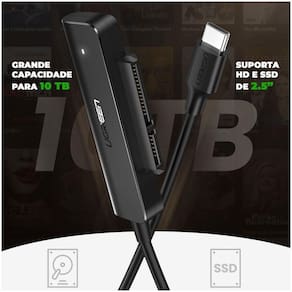 Este adaptador de USB-C para SATA III permite acesso rápido ao seu armazenamento e em qualquer lugar, seja ele HDD ou SDD.