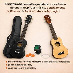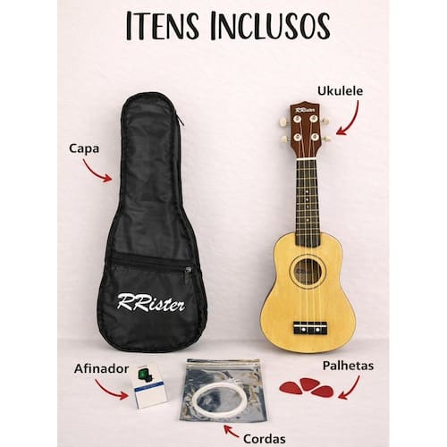 Ukulele acústico soprano capa 3 paletas + afinador A rrister resolveu trazer para o mercado brasileiro seu ukulele pois sabe que o brasileiro é apaixonado por música, e tem paixão pela arte, incentivando novos músicos a despertar seu talento. Nosso ukulele é ideal para iniciar neste universo maravilhoso da música. Construído com alta qualidade e excelência de quem respira a música, o acabamento brilhante de fácil ajuste e adaptação fazem o ukulele rrister a escolha correta. Instrumento feito de madeira e com cravelhas reforçadas, já acompanha cordas, capa protetora e palhetas. Palavras-chave: instrumentos musicais, instrumento, instrumento musical, ukulele soprano, preço ukulele, kulele Especificações técnicas: Marca: rrister Modelo: 01uk - soprano Material do ukulele: mdf Material das cordas: nylon Tamanho: 53cm Itens inclusos: 1 ukulele 1 afinador 1 capa 3 palhetas 4 cordas de 3 meses contra quaisquer defeitos de fabricação e transporte. A não contempla problemas por mau uso do produto. Marca: Não Informado