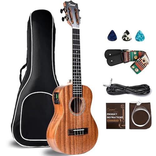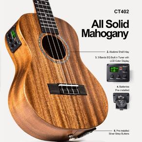 Especificações: Modelo NO: CT402PJ Corpo de mogno Escala e ponte de nogueira maciça. Porca de osso de búfalo e sela 18 trastes Cordas de carbono Caramel Technique Tamanho: Escala tenor 17 26 Comprimento total do corpo Comprimento do corpo 11-3/5. Profundidade do corpo 2-3/4. 1-3/8 na porca Eletrônicos: 3 controles de equalização de banda: baixo, médio, agudos Afinador cromático com visor LCD colorido. Indicador de bateria fraca. Fonte de alimentação: 3V (CR2032) X2 A embalagem inclui: 1 Ukulele Tenor Caramel Mahogany (com afinador) 1 cordão de nylon adicional. 1 bolsa Gig Bag. 3 palhetas de guitarra 1 pano de limpeza. 1 alça de ukulele (com pinos). 1 cabo equalizador. 1 manual do utilizador (sem garantia - Concentre em ukulele de madeira sólida – Os ukeleles tenores Caramel CT402PJ de 66 cm são feitos de toda a madeira sólida de mogno, que oferece ao ukulele melhor sustentação, som mais estável e tom puro, também alcançam melhor ressonância. Os ukuleles Caramel são o instrumento de escolha para profissionais e iniciantes. - Um passo para um tocador de ukulele: você quer aprender a tocar Ukulele? Este kit Ukelele para iniciantes ajuda você a começar! Vem com: 1 Ukelele Tenor de 66 cm, 1 conjunto extra de cordas G-C-E-A, bolsa de apresentação, 3 palhetas de guitarra, 1 pano de limpeza, 1 alça de ukulele (com pinos), 1 x cabo EQ, 1x instruções (sem garantia de versão em português) - UKULELE INCOMPARÁVEL - 3 bandas equalizador integrado sintonizador com visor LCD colorido, não é um problema para um show! Caramel ukalalee soa quase como um ukulele profissional caro. Luthiers sintonizou um por um antes de enviarmos seu ukulele, não se preocupe com jogadores iniciantes ou crianças. Esta é uma escolha que faz você possuir por toda a vida - Alta qualidade – Comece sua jornada de músico com um ukulele de madeira maciça real, pare de comprar brinquedos de plástico! Os ukuleles tenores, o tamanho de 66 cm é melhor do que o concerto, apenas 7,6 cm maior, mas com melhor som e trastes mais amplos que são melhores para adultos, novatos, músicos intermediários ou profissionais que começam a praticar. Este pacote ukele é sua melhor escolha! G-C-E-A sintonizado. - ATENDIMENTO AO CLIENTE PROFISSIONAL - A equipe da Caramel tem anos de experiência no setor e está comprometida em fornecer a você um serviço profissional e atencioso. Sinta-se à vontade para entrar em contato conosco a qualquer momento se encontrar algum problema durante o uso. Junte-se a nós agora e deixe a Caramel acompanhá-lo em sua jornada musical, criando melodias doces juntos.