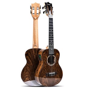 Ukulele elétrico e acústico tenor brilhante Butterfly Bocote - Apelo visual impressionante: o bocote apresenta padrões de grãos impressionantes e tons dourados vibrantes, tornando cada peça única. Suas belas variações naturais não apenas melhoram a estética do instrumento, mas também adicionam calor e profundidade ao som geral, garantindo que cada nota ressoe com personalidade. - Artesanato genuíno feito à mão: ao contrário de muitas outras marcas que dependem da produção de fábrica, a Caramel Ukulele se orgulha de sua construção autêntica feita à mão. Cada ukulele é meticulosamente trabalhado por sua equipe qualificada, com o mínimo de uso de máquinas. Esta abordagem prática garante qualidade superior e atenção aos detalhes. - Acabamento brilhante requintado: TEG95 apresenta um acabamento brilhante exclusivo que os diferencia dos ukuleles padrão. Semelhante ao processo meticuloso utilizado para acabamentos de laca de piano, cada ukulele passa por várias rodadas de polimento cuidadoso. O resultado é uma aparência deslumbrante, durável e brilhante que chama a atenção. - Cordas de fibra de carbono para desempenho excepcional: as cordas de ukulele especialmente projetadas da Caramel foram amplamente testadas e são conhecidas por sua excelente jogabilidade e tom claro. Estas cordas de fibra de carbono proporcionam uma experiência de toque confortável enquanto produzem uma qualidade de som rica e ressonante, tornando-as perfeitas para músicos iniciantes e experientes. - Máquina de afinação premium para desempenho confiável: os ukuleles Caramel se destacam com suas máquinas de afinação de alta qualidade. Geralmente encontrados em instrumentos artesanais de alto preço, esses afinadores apresentam um tom preto elegante, textura metálica forte e polimento requintado. Com uma relação de engrenagem 18: 1 atualizada, esses sintonizadores oferecem ajuste preciso e confiável, garantindo que seu ukulele permaneça perfeitamente afinado.