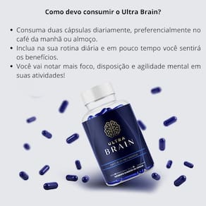 - consuma duas cápsulas diariamente. Ao incluir o Ultra Brain em sua rotina diária, em pouco tempo você começará a perceber os benefícios. Você notará um aumento no foco, disposição e agilidade mental, ajudando a potencializar sua produtividade e bem-estar.Ingredientes:taurina, bitartarato de colinal, Extrato de rizomas de Curcuma Longa, Bisglicinato de magnésio, Inositol, L-triptofano, Fosfatidilserina de lecitina de soja e Cianocobalamina vitamina B12 .