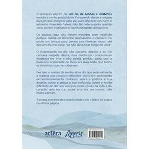 O universo escrito de Um rio de sonhos e mistérios invadiu a minha privacidade. Foi quando deixei a origem daquilo que imaginei para ele, para oferecer um novo e estranho itinerário, talvez não tão interessante quanto seria, porém instigante e oportunamente obrigatório. Os passos aqui não foram medidos com exatidão porque, diante de tamanho desmantelo, o cansaço me pediu um tempo para pensar por diversas vezes, até que um dia me disse: “só não deve ficar longe de você”. O interessante do dia não passava daquilo e eu me cansava naquela labuta, mas diante do compromisso mostrava-me viva e não sentia solidão, sabia que a presença onipotente de Deus era mais forte que todos os mistérios que me rodeavam. Por isso o sorriso da minha alma diz que serei estímulo à medida que provoco reflexões: sobre um sentimento extraordinariamente maldoso; sobre a política e sua anomia; sobre a justiça e sua ineficácia; sobre o modo diferente de dar um voo livre pelas coisas da vida e do coração pela escrita; sobre arte em um mundo não muito comum. A nossa aventura de cumplicidade com o leitor só acaba na última página. Marca: ARTERA EDITORA