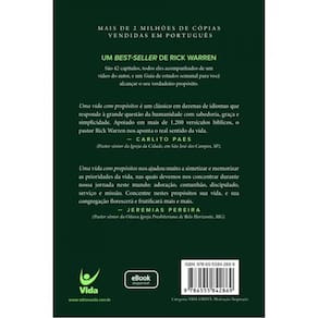 MAIS DE 2 MILHÕES DE CÓPIAS VENDIDAS EM PORTUGUÊS UM BEST-SELLER DE RICK WARREN. São 42 capítulos, todos eles acompanhados de um vídeo do autor, e um Guia de estudos semanal para você alcançar o seu verdadeiro propósito.Uma vida com propósitos é um clássico em dezenas de idiomas que responde à grande questão da humanidade com sabedoria, graça e simplicidade. Apoiado em mais de 1.200 versículos bíblicos, o pastor Rick Warren nos aponta o real sentido da vida CARLITO PAES - Pastor sênior da Igreja da Cidade, em São José dos Campos, SP Uma vida com propósitos nos ajudou muito a sintetizar e memorizar as prioridades da vida, nas quais devemos nos concentrar durante nossa jornada neste mundo: adoração, comunhão, discipulado, serviço e missão. Concentre sua vida nesses propósitos, e sua congregação florescerá e frutificará mais e mais. JEREMIAS PEREIRA - Pastor sênior da Oitava Igreja Presbiteriana de Belo Horizonte, MG