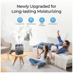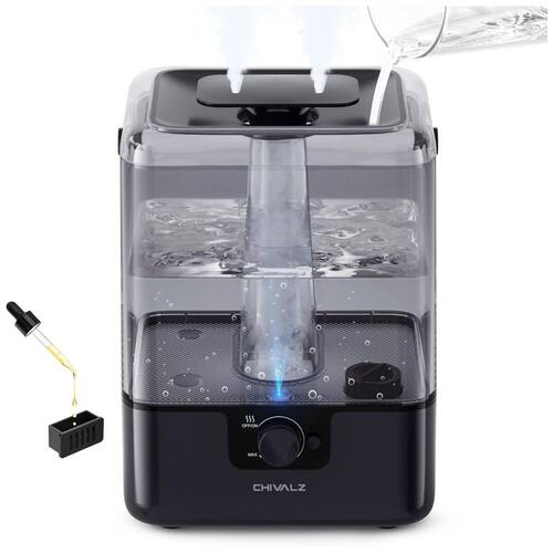 O umidificador CHIVALZ é um equipamento 2 em 1 que atua como um umidificador e difusor, projetado para melhorar a qualidade do ar em sua casa. Com um tanque de água de 6 litros, ele pode funcionar por até 50 horas com um único abastecimento. Para melhores resultados e benefícios à saúde, recomenda-se o uso de água destilada ou purificada.