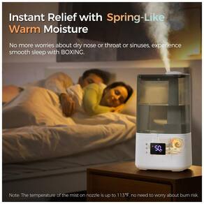 O Umidificador BOXING de 6 litros mantém seu ambiente confortavelmente úmido por até 60 horas, proporcionando umidade contínua e relaxamento máximo para toda a família. Acabe com a pele seca, irritada e o ar abafado acordando revigorado com seu vapor quente e uniforme. Ajuste facilmente os níveis de umidade com o sensor inteligente, permitindo um ambiente perfeito para você e sua família. Durma em silêncio com o modo sono ativado, desfrutando de um ambiente calmo sem interrupções. Aromaterapia integrada, desligamento automático por falta d'água, seguro para bebês e adultos. Transforme seus momentos de relaxamento com o Umidificador BOXING!