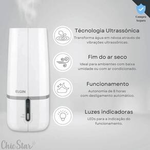 Características: - material: plástico; - cor: branco/bege; - bivolt 127v e 220v ; - potência: 18 w; - tamanho do reservatório: 2 litros; - vazão: 200 ml/h; - autonomia: 08 horas; - ajuste da névoa: botão com 3 velocidades; - botão liga/desliga: sim; - aviso de falta de água: sim indicação com luz vermelha ; - tecnologia: ultrassônica; - código elgin: unzn02n0na; - garantia: 12 meses fabricante; - peso: 0,53 kg; - dimensões do produto a x l x p :27 x 12,2 14,7 cm.