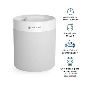 - Marca: Dellamed - Modelo: Umi LIGHT - Capacidade: 2,3 L - Autonomia: 10–12 h contínuas - Volume de névoa: 50–150 ml/h - Área recomendada: até 20 m² - Dimensões: 19 × 16 cm - Cabo: 120 cm (USB-C) - Alimentação: DC5V/3W — Bivolt (127–240V) - Garantia: 12 meses diretamente com fornecedor