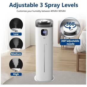Este umidificador de ambiente grande possui uma capacidade de 9 a 9,10 litros e oferece ajuste de umidade em 3 velocidades: baixa, média e alta. Com um volume de névoa constante de até 300 mL/h, ele proporciona até 72 horas de umidificação contínua, com opções de névoa intermitente de 1, 3 e 5 minutos.