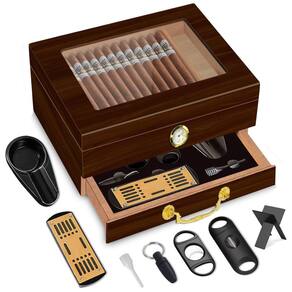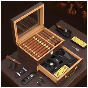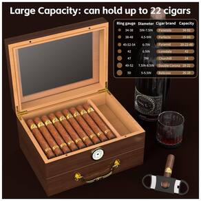 O conjunto de acessórios de luxo com gaveta desta umidora de charutos apresenta uma gaveta para armazenar acessórios essenciais para charutos. Ideal para fumantes de charutos, viagens com charutos e acessórios de charuto. Mantenha a umidade ideal com o higrômetro ajustável, monitorando a umidade entre 60 e 70, garantindo frescor ótimo para seus charutos. Feito de Cedro Espanhol de alta qualidade, esta umidora armazena até 2050 charutos, dependendo do calibre. Com selo magnético e dobradiças metálicas, garante um fechamento firme para preservar seus charutos. O divisor móvel e a tampa de vidro oferecem fácil visibilidade. Artesanal e portátil, perfeito para uso em mesa, viagens ou escritório. Funciona como um umidificador portátil, estojo de charutos ou um umidificador pequeno. Versátil e portátil, mantenha seus charutos frescos com esta umidora premium, ideal para fumantes de charutos e entusiastas de charutos.