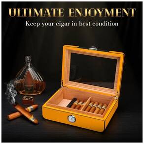A Caixa de Cedro de alta qualidade da marca Bald Eagle atua como um regulador de umidade natural, absorvendo e liberando umidade para manter níveis ideais. Seu aroma único ajuda a proteger e realçar o sabor do seu charuto precioso. O sistema de umidificação conta com um higrômetro que detecta mudanças de umidade a tempo. Em caso de leitura abaixo de 65, basta adicionar 25 gotas de água destilada ou solução de PG ao humidificador e aguardar por 12 dias. O revestimento de cedro e as guarnições de borracha ao redor do higrômetro proporcionam um fechamento hermético, evitando efetivamente a perda de umidade. O design único, com acabamento de alto brilho, pintura amarela e fibra de carbono, cria uma decoração luxuosa para seus charutos. A tampa de vidro permite visualizar facilmente seu estoque de charutos e condições. Além disso, o serviço de embalagem premium oferece proteção completa, tornando-a um presente perfeito para os amantes de charutos. O serviço de pós-venda amigável está sempre disponível para ajudar com quaisquer questões.