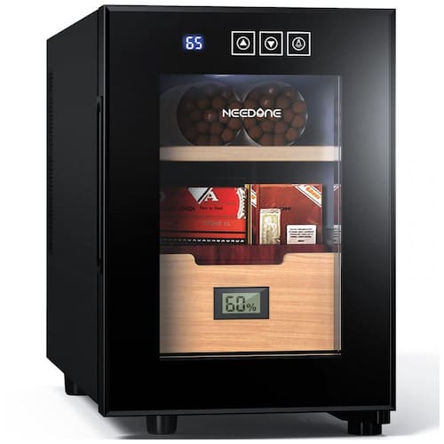O Humidificador de Charutos NEEDONE é perfeito para colecionadores exigentes. Integrando de forma perfeita funções de aquecimento e refrigeração, ele se adapta a todas as estações do ano. Com controle de temperatura variando de 11°C a 23°C, e faixa de temperatura ambiente recomendada entre 5°C e 25°C, mais ampla que a maioria dos concorrentes. Este umidor permite atingir facilmente a temperatura ideal para o envelhecimento e maturação da sua coleção. Seu sistema de resfriamento de ar de circulação 360 simula a circulação de ar para cobrir uniformemente cada item, mantendo efetivamente a umidade adequada. Feito de madeira de cedro, que adiciona fragrância e sabor diversos, este umidor possui um display digital de higrômetro de corpo inteiro, permitindo monitorar os níveis de umidade com precisão. Com capacidade para até 100 charutos (dependendo do tamanho do aro), possui interface sensível ao toque em painel de vidro, operação ultra silenciosa abaixo de 35dB e iluminação interna de vidro duplo para facilitar a localização e seleção dos seus itens com elegância.