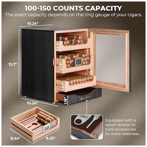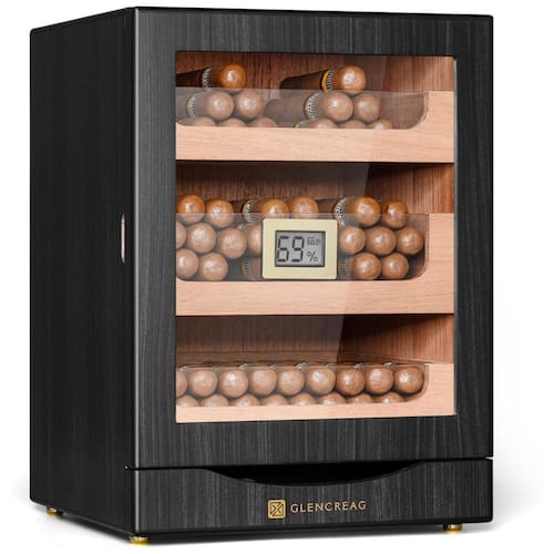 O armário umidor de charutos GLENCREAG MET1031 apresenta 3 gavetas para charutos e uma gaveta adicional para acessórios de charutos. As gavetas variam em capacidade, permitindo a organização de charutos de diferentes tamanhos. Com capacidade para até 150 charutos, dependendo da bitola do charuto. Controle Preciso de Umidade: O termo-higrômetro digital mede com precisão a umidade e temperatura no armário. 2 umidificadores de gel de cristal fornecem liberação constante de umidade para manter níveis adequados de umidade. Vedação Firme: A porta de vedação magnética mantém a umidade estável para os charutos. O revestimento de cedro espanhol mantém os charutos frescos e fragrantes. Além disso, o design único de fluxo de ar na parte inferior da gaveta proporciona um ambiente mais respirável para os charutos. Design Prático: O umidor possui um acabamento fosco premium, com superfície pintada e polida para ser suave ao toque e resistente à sujeira. O design da porta de acrílico transparente com ângulo de abertura de 180 graus permite verificar as condições dos charutos e o nível de umidade sem abrir a porta e comprometer o equilíbrio da umidade. Ótima Ideia de Presente: O design perfeito faz do nosso umidor de charutos uma excelente escolha de presente para amantes de charutos, pais, maridos e amigos.