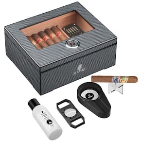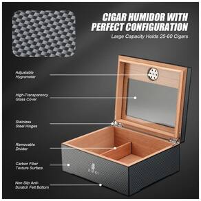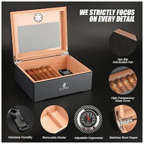 O umidor de charutos XIFEI apresenta um design de fibra de carbono na superfície, acabamento brilhante e trabalho requintado. O interior é revestido com madeira de cedro espanhol e forro de madeira sólida, proporcionando resistência à umidade e à pressão dos charutos. A janela de vidro no topo permite observar os charutos a qualquer momento. Com capacidade para 25-60 charutos, a capacidade de armazenamento depende do calibre e do tamanho dos charutos. Possui higrômetro ajustável embutido para monitorar e ajustar facilmente a umidade. Acompanha solução de umidificação, um cortador de charutos durável, um suporte de acrílico e um cinzeiro dedicado. Um conjunto de presente perfeito com design elegante, ideal para homens em diversas ocasiões. Valorizamos a experiência de cada cliente.