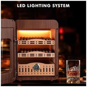 Iluminação LED para Exibição Elegante: As luzes LED embutidas iluminam sua coleção de charutos, destacando cada um deles de maneira sofisticada. A porta de vidro vedada exibe elegantemente os charutos, criando um ambiente refinado que valoriza seu estilo e bom gosto, além de manter as condições ideais de armazenamento.