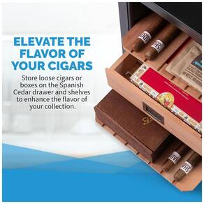 Prateleiras de Cedro Espanhol para Melhor Sabor: Armazene os charutos na gaveta de cedro espanhol de alta qualidade ou coloque as caixas de charutos nas prateleiras ventiladas de cedro espanhol. O cedro espanhol melhora o sabor dos charutos e ajuda a manter a umidade ideal dentro do umidor.