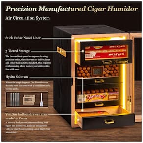 O umidor de Charuto da Marvero tem capacidade para 200 charutos e oferece 5 gavetas de cedro removíveis com alças, ideais para a maioria dos umidificadores de charutos elétricos. Feito com materiais de qualidade, como revestimento de cedro natural que mantém a umidade e o frescor dos charutos, e uma durável porta de vidro temperado que permite uma fácil observação dos níveis de umidade, garantindo proteção abrangente para sua coleção de charutos. Com um design maravilhoso, com gabinete arredondado, gaveta de noz marrom e hardware banhado a ouro em ambos os lados, o umidor da Marvero se destaca no mercado. Possui 4 umidificadores, 2 pacotes de umidade e um higrômetro digital frontal para monitoramento fácil da umidade. Além disso, conta com um sistema de iluminação LED trilateral para facilitar a observação dos charutos e pode ser alimentado por bateria ou cabo Type-C, oferecendo portabilidade e confiabilidade. Um presente esplêndido para apreciadores, ideal para bares, escritórios ou estudos. Perfeito como presente para pais, maridos ou amigos.