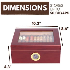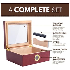 Feito à mão com a fina madeira de cedro espanhol genuíno, este umidor pode armazenar até 2550 charutos e possui um acabamento rico, tampo de vidro e design elegante. Acompanha um umidificador, higrômetro e um divisor móvel para organizar seus charutos. Como acessório de charuto de alta qualidade, a caixa do umidor inclui um suave protetor de veludo preto resistente a riscos na parte inferior, ideal para proteger suas superfícies e a caixa de charutos de danos por atrito. Um presente perfeito para amantes de charutos, ideal para pais, maridos e amigos. Adequado para armazenar charutos em casa, em viagens ou no escritório. Para obter melhores resultados, coloque seu umidor de charutos em um ambiente fresco.