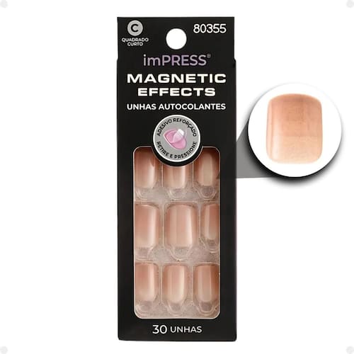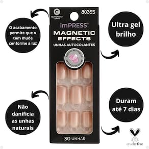 Conheça a nova era das cores. As unhas imPRESS Magnetic Effect são de outro mundo! Seu design premium traz cores exclusivas de efeito magnético, no formato curto e quadrado, seu acabamento permite que o tom mude conforme a luz. Tenha o resultado de salão em casa em poucos minutos.As unhas possuem a tecnologia Pure Fit, ou seja, SUPER slim & SUPER confortáveis, permitindo melhor ajuste na região das cutículas. A tecnologia patenteada do adesivo Super Hold, foi renovada, trazendo um adesivo muito mais reforçado, o que permite segurança no uso. Não deixe de lado o conforto e resultado de salão em casa, que só uma unha KISS NEW YORK pode proporcionar.