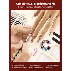 6. Esta mão de silicone pode ser usada para praticar unhas e tatuagens. Também é adequada para joias, anel, luva, relógio. Inclui: 1 x mão marrom de silicone para praticar unhas 1 x 100 unidades de pontas de unhas transparentes 15 x caneta de unhas Arious 1 x caixa de diamantes coloridos 1 x 2 peças de limas de unhas 1 x 1 peça de pincéis de acrílico Nota: 1.