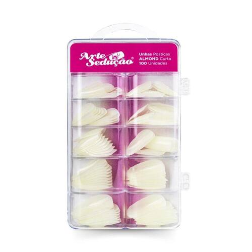 Contém: 01 - Caixa Acrílica com 100 Unidades de Unhas Postiças Formato Almond Curta, Leitosa, Arte Sedução