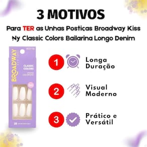 As Unhas Postiças Broadway Kiss NY Bailarina Longo Denim Bco15b são perfeitas para diversas ocasiões, desde o uso diário para quem busca um toque de cor e estilo, até eventos especiais onde você deseja um visual impecável e prático. Ideais para quem ama a cor e o formato bailarina, e quer unhas feitas em minutos com um acabamento profissional.