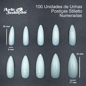 Contém: 01 - caixa acrílica com 100 unidades de unhas postiças formato stiletto, arte sedução Atenção: não acompanha o tamanho 5. Unhas postiças de excelente qualidade, possuem ótimo custo benefício. Tendência, as unhas stiletto levam esse nome por seu formato remeter-se a um estilete, com as pontas triangulares e bem finas, carregadas de personalidade e atitude. Perfeitas para quem tem unhas fracas e quebradiças; são super resistentes, protegem e proporcionam o crescimento saudável da unha. Garantem esmaltação impecável e resultado que dura por mais tempo. Indispensável para as profissionais que desejam atender todos os desejos de suas clientes ou para você que quer deixar suas unhas lindas e bem feitas no conforto da sua casa. Unhas de tamanhos variados e enumeradas para facilitar a aplicação. Acompanha caixinha acrílica com divisórias que auxiliam no armazenamento. Não acompanha cola. Especificações: Marca: arte sedução Modelo: stiletto Tipo: unha postiça Cor: branco Quantidade: 100 unidades Tamanho: diversos Composição: plástico abs Boas compras ; ) Marca: Arte Seducao
