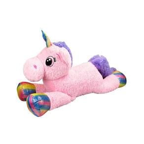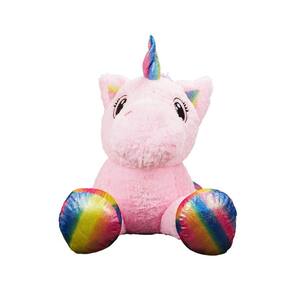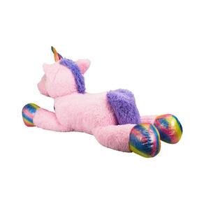 Bichinho de pelúcia no formato de um unicórnio rosa gigante com 120 cm de comprimento deitado. O Unicónio é na cor rosa com patas e chifre na cor arco-íris. Material: poliéster; Enchimento: fibra de poliéster; Produto certificado pelo ICEPEX, Órgão acreditado pela CGCRE do INMETRO