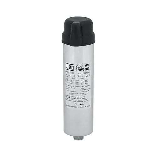Desenvolvidos a base de filme de polipropileno metalizado auto-regenerativo, possui dispositivo interruptor de segurança contra sobre pressão interna e baixas perdas dielétricas. Resumo das características técnicas Potência reativa 1.5 kVAr Tensão nominal Ue 220V60Hz Frequência 60 Hz Tipo do terminal Parafuso Série D código: 10046001 Série D Capacitância (ligação delta) 27.4 Tolerância da capacitância 5% Expectativa de vida 100.000 h Classe de temperatura -25/D Capacidade de curto circuito 10 kA Conexão da resistência de descarga Interno Material de preenchimento Resina poliuretana Máxima tensão 1,3 x Vn Grau de proteção IP50 Peso bruto 0,567 kg