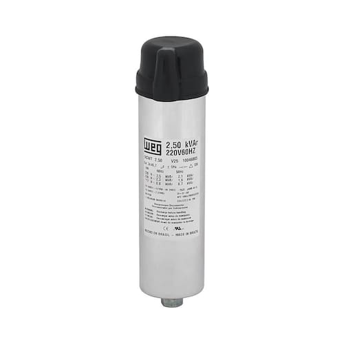 Desenvolvidos a base de filme de polipropileno metalizado auto-regenerativo, possui dispositivo interruptor de segurança contra sobre pressão interna e baixas perdas dielétricas. Resumo das características técnicas Potência reativa 2.5 kVAr Tensão nominal Ue 380V60Hz Frequência 60 Hz Tipo do terminal Parafuso Série D código: 10046010 Série D Capacitância ligação delta 15.3 F Tolerância da capacitância 5% Expectativa de vida 100.000 h Classe de temperatura -25/D Capacidade de curto circuito 10 kA Conexão da resistência de descarga Interno Material de preenchimento Resina poliuretana Máxima tensão 1,3 x Vn Grau de proteção IP50 Peso bruto 0,612 kg Ean: 7890355041765
