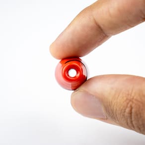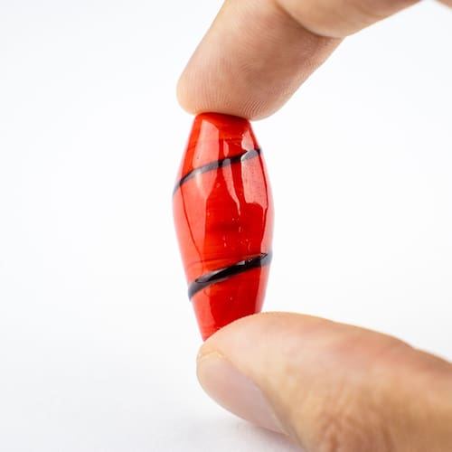 Composição: 100% vidro Formato de "azeitona" com furo passante no meio Dimensões da peça aproximada: 3,5 cm X 1,5 cm