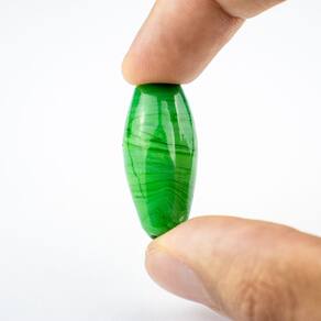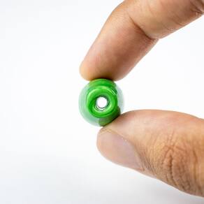 Composição: 100% vidro Formato de "azeitona" com furo passante no meio Dimensões da peça aproximada: 3,5 cm X 1,5 cm