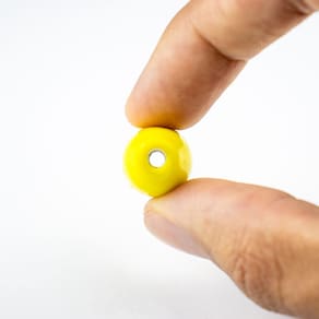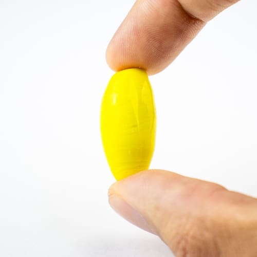 Composição: 100% vidro Formato de "azeitona" com furo passante no meio Dimensões da peça aproximada: 3,5 cm X 1,5 cm