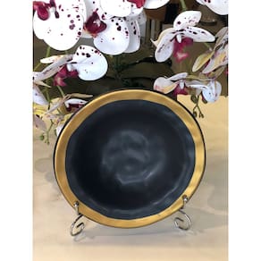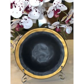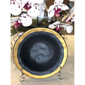 O Prato Fundo Amassado com filete dourado tem design contemporâneo e minimalista, o prato amassado tem linhas orgânicas. A cor preta fosca traz requinte e bom gosto na hora de servir.Feito de material resistente e de qualidade, possui um formato fundo que é perfeito para servir sopas, ensopados, macarrão e outros pratos. Sua capacidade generosa permite que você desfrute de refeições deliciosas.
